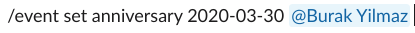 • /event set anniversary <YYYY-MM-DD> <user>