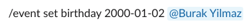 • /event set birthday <YYYY-MM-DD> <user>