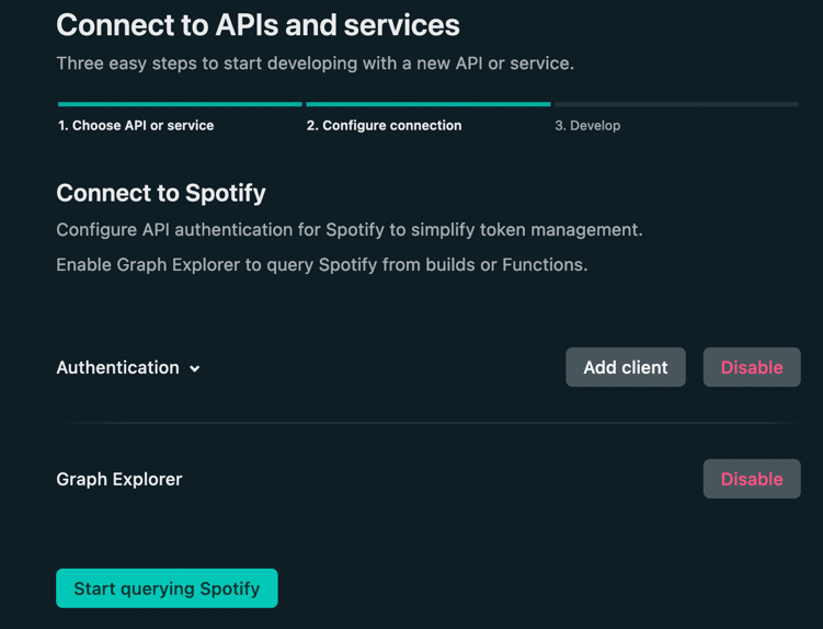 Netlify Console --> Sample App --> Graph --> Connect API or Service --> Spotify