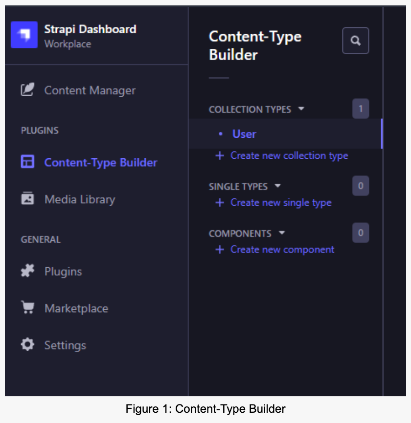 After you log in, you can model your first data collection with the Strapi Content-Type Builder. Figure 1 shows where you can find the Content-Type Builder in the Strapi admin console.