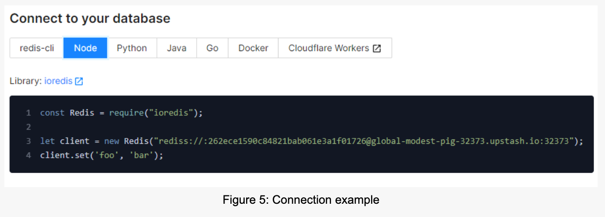 After the creation process finishes, you can grab the database URL, which should only take seconds. Choose the “Node” tab, and copy the URL from the code example as seen in Figure 5.