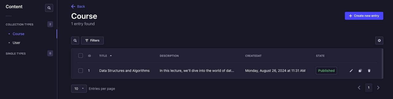 Now, lets add some data. Go to Content Manager -> Course section on the sidebar and click on Create new entry, fill in the fields and click the Save and then Publish.